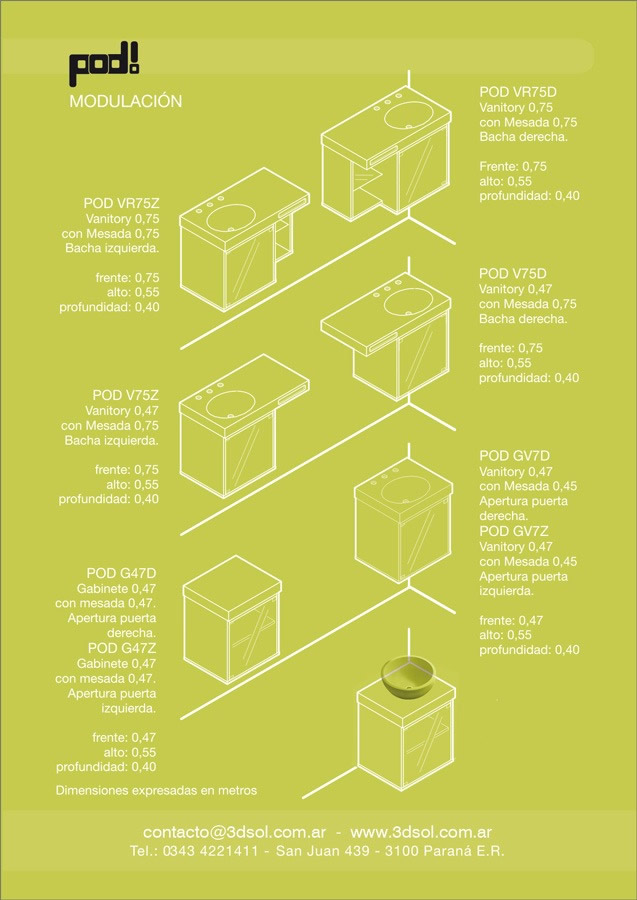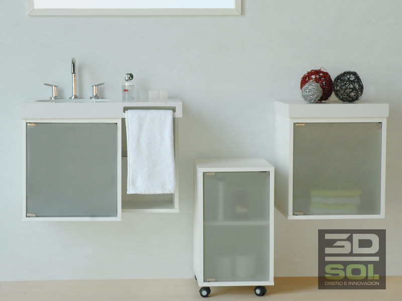 LÍnea POD hechos con mesadas de TRESOL y muebles en MDF con todas sus características y modulaciones. Equipamiento para el baño, práctico y fácil de instalar. Combina mesadas y bachas de alta resistencia, con gabinetes que ofrecen un amplio espacio de guardado.