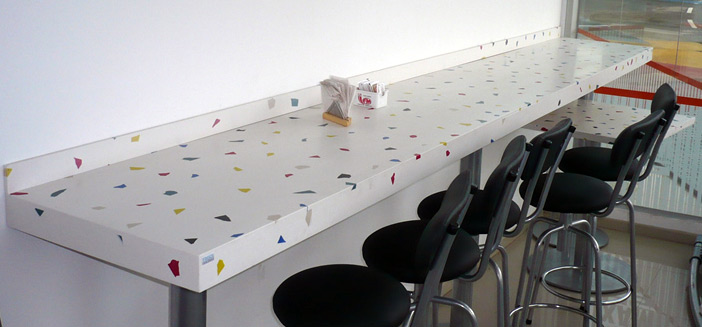 Una placa monolítica compuesta por resinas acrílicas, poliéster con carga de alúmina. Posee una apariencia sólida y en algunos casos parece piedra.